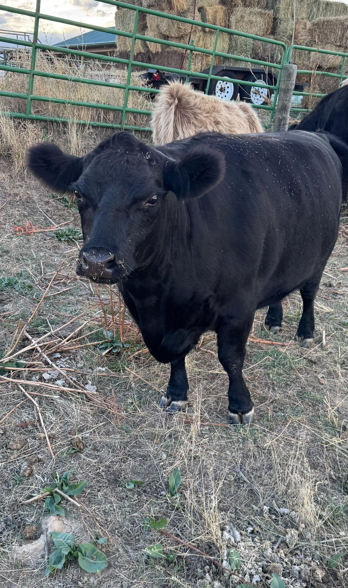 Black cow at golden hour with wildflowers